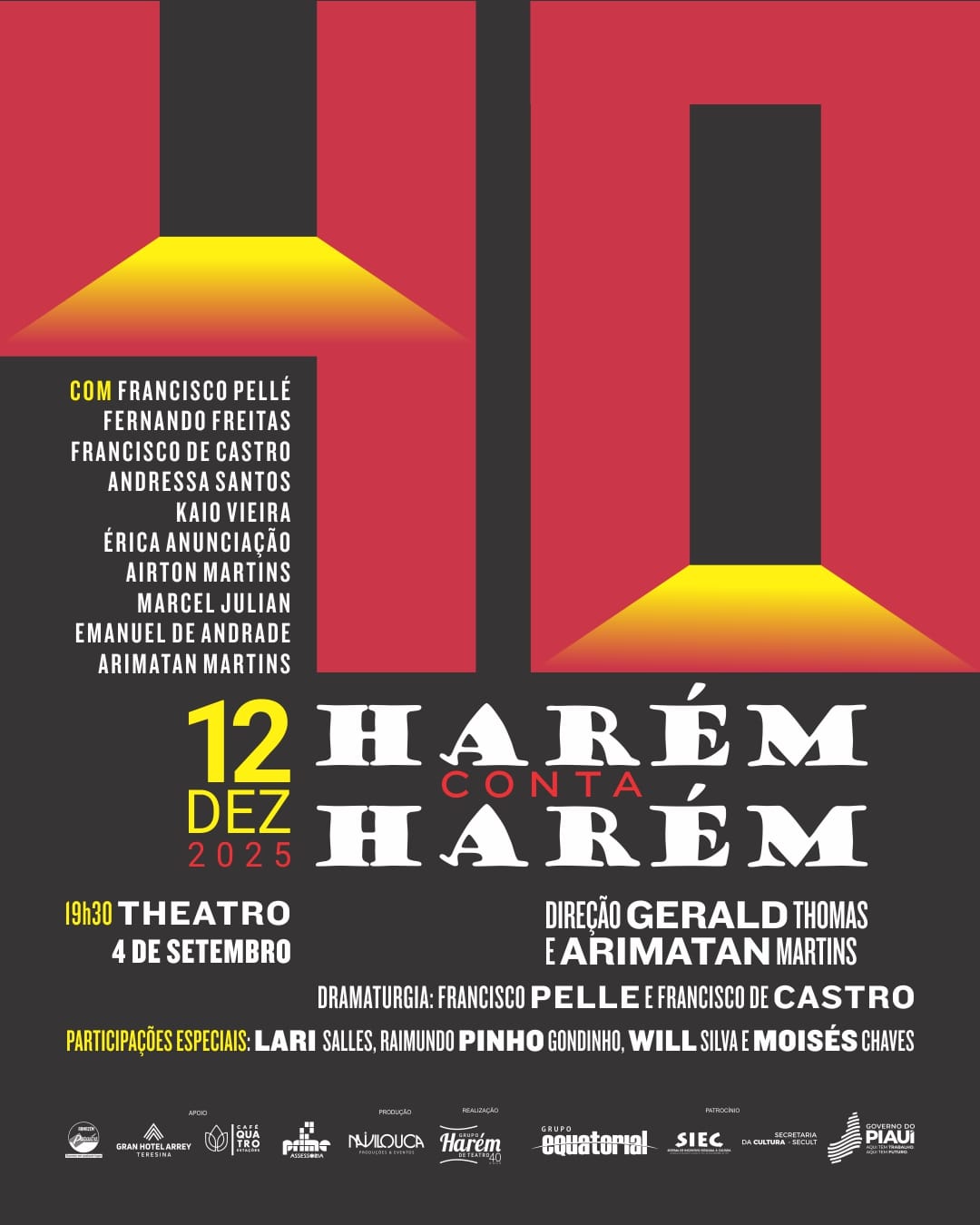 Os evento serão nesta sexta-feira (12), dia em que o grupo apresentou a primeira peça em 1985. Com entrada gratuita, a partir das 19h30, no Theatro 4 de Setembro, será apresentado “Harém conta Harém”, com direção de Arimatan Martins e Gerald Thomas, um dos mais renomados diretores do teatro brasileiro, que está em Teresina para os ensaios e apresentação.