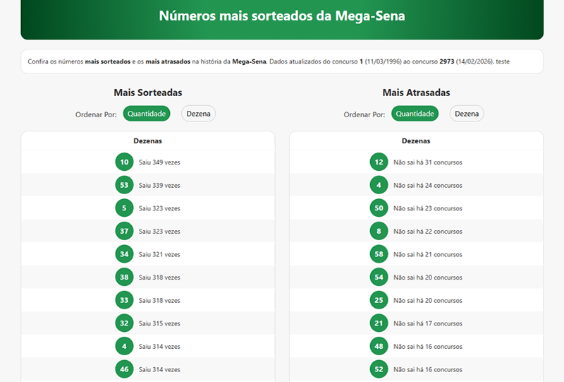Quer conferir a lista completa com todas as 60 dezenas, incluindo as mais atrasadas? Acesse a página de números mais sorteados da Mega-Sena no Lotorama e acompanhe as estatísticas atualizadas a cada concurso.