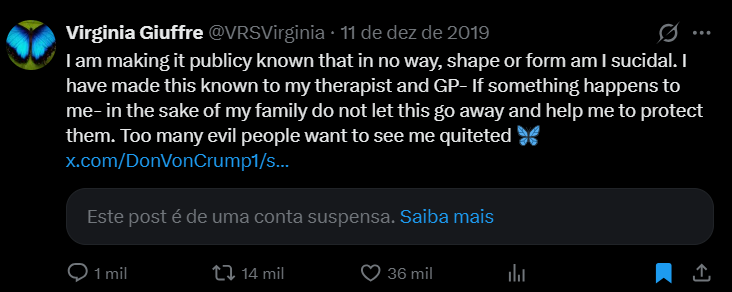 Andrew também foi acusado de agressão sexual por Virginia Giuffre, uma das principais denunciantes do caso Epstein. As acusações dizem respeito a episódios que teriam ocorrido quando ela ainda era menor de idade — alegações que o ex-príncipe sempre negou. Giuffre morreu em 25 de abril de 2025, na Austrália, aos 41 anos, segundo familiares, por suicídio.